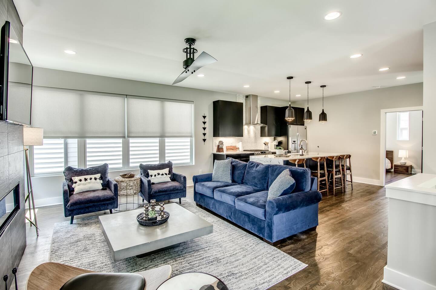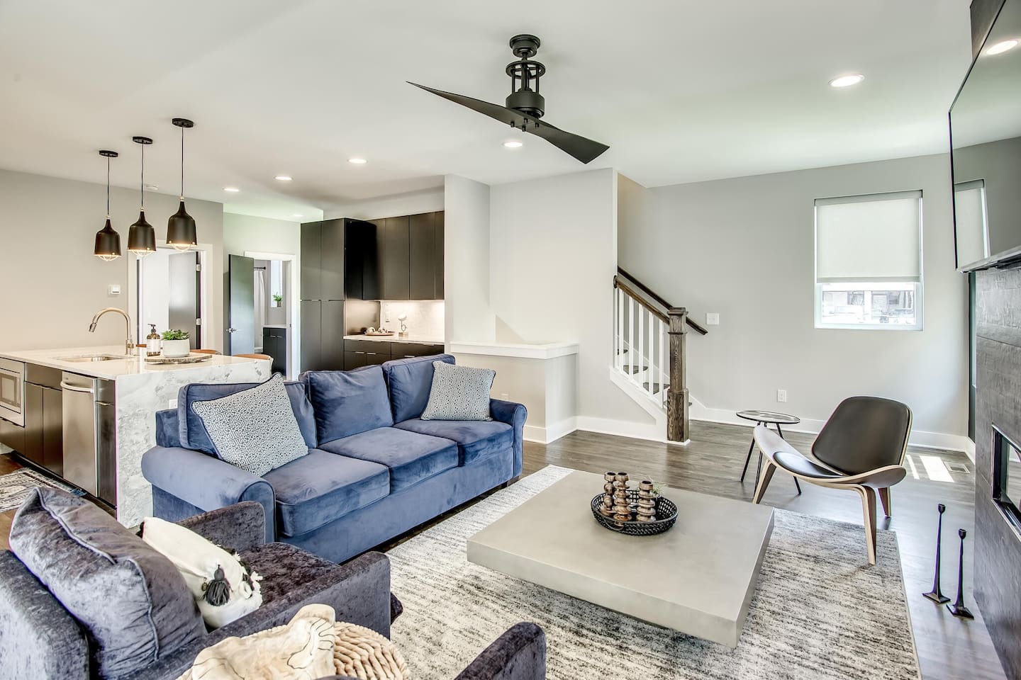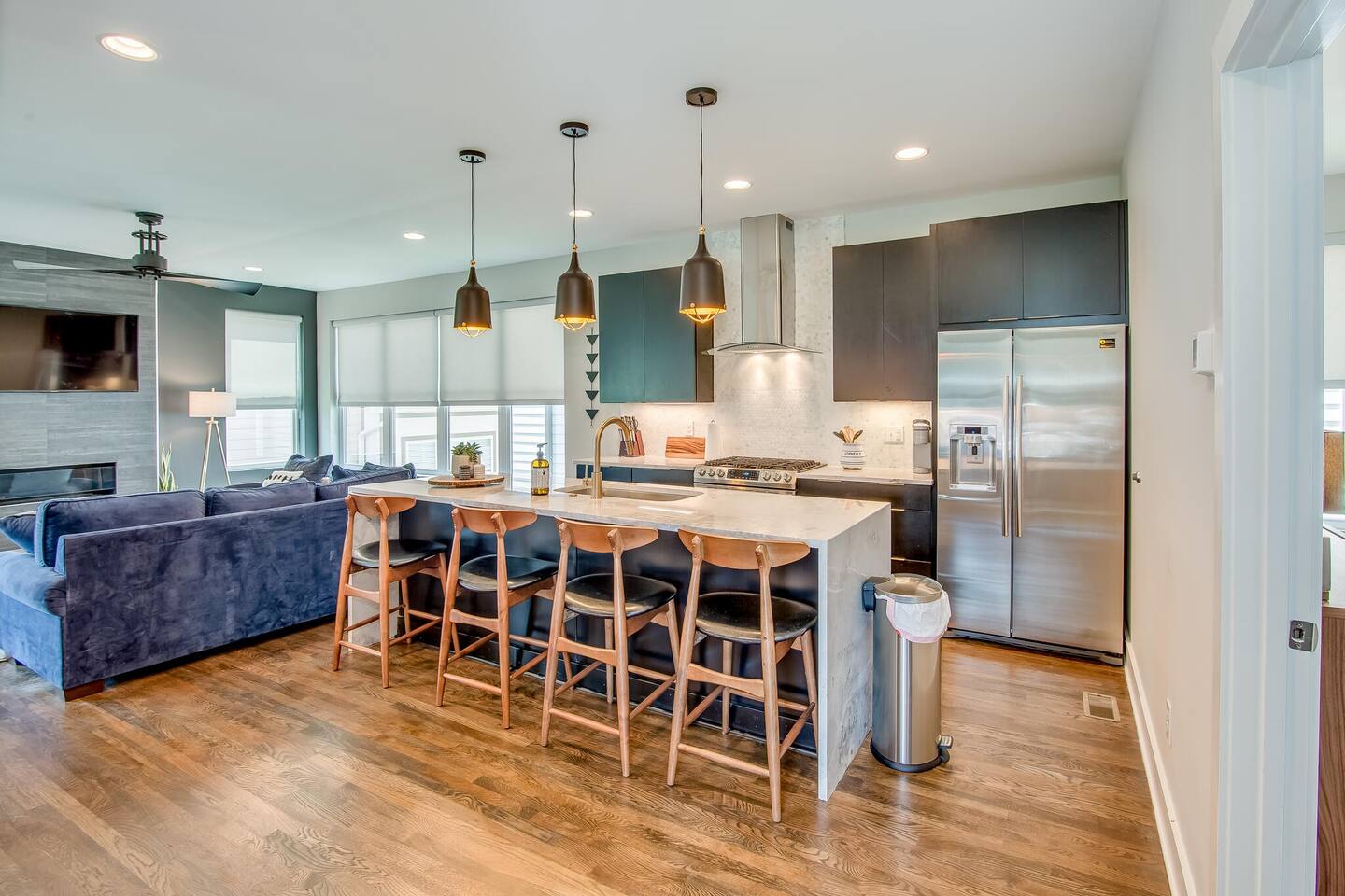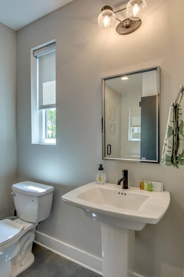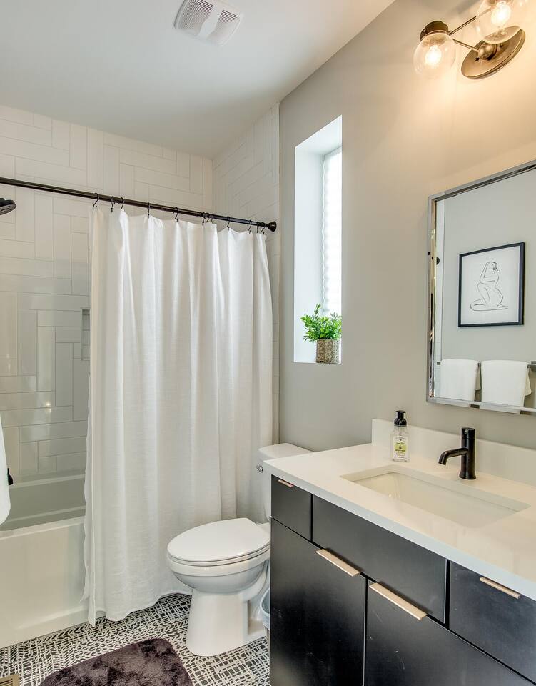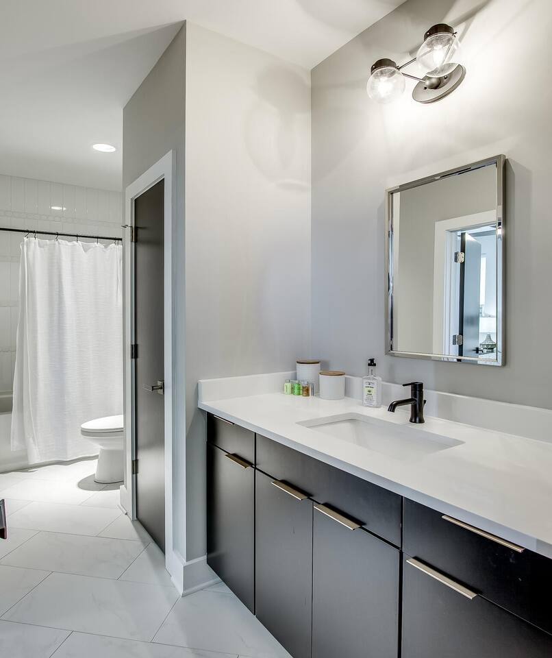 This modern home features 4 bedrooms and 4 full baths, a fully stocked kitchen w/bar seating, a spacious living room, 2 car garage, rooftop patio w/ amazing views. We are walking distance to the popular hotspot known as the Gulch. We are a short $5 Uber/Lyft to downtown, Broadway, Demonbreun St., Bridgestone Arena, & Nissan Stadium. Enjoy comfort with all beds Queen size or King, and plenty of room throughout the home to spread out comfortably. Early bag drop available before check in.