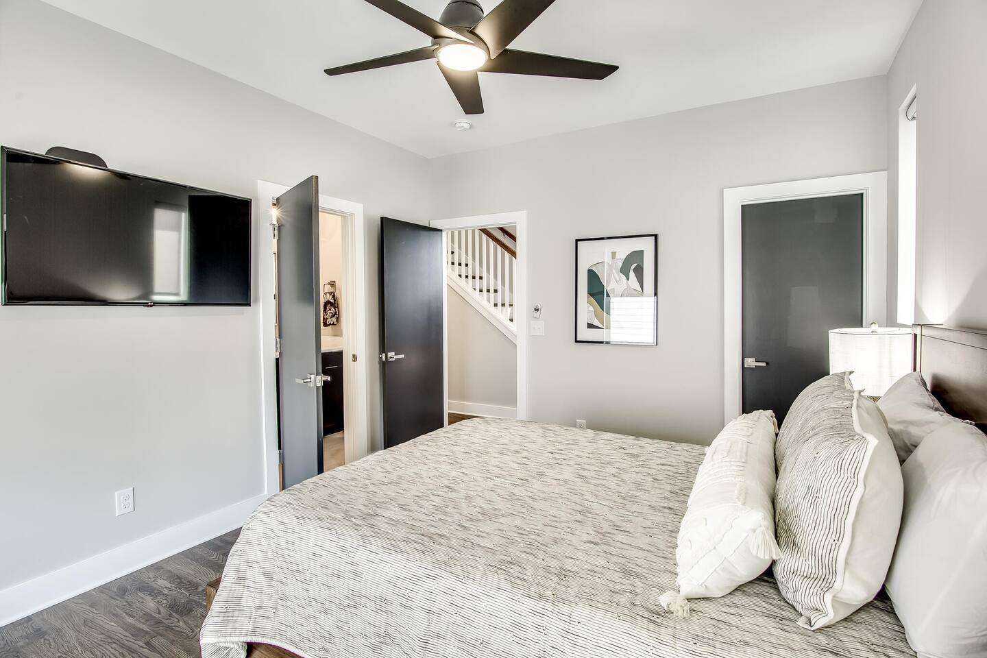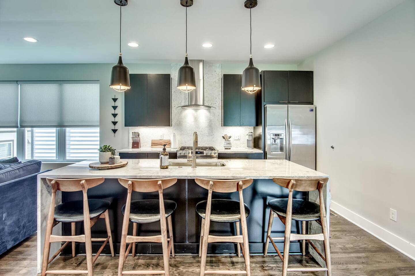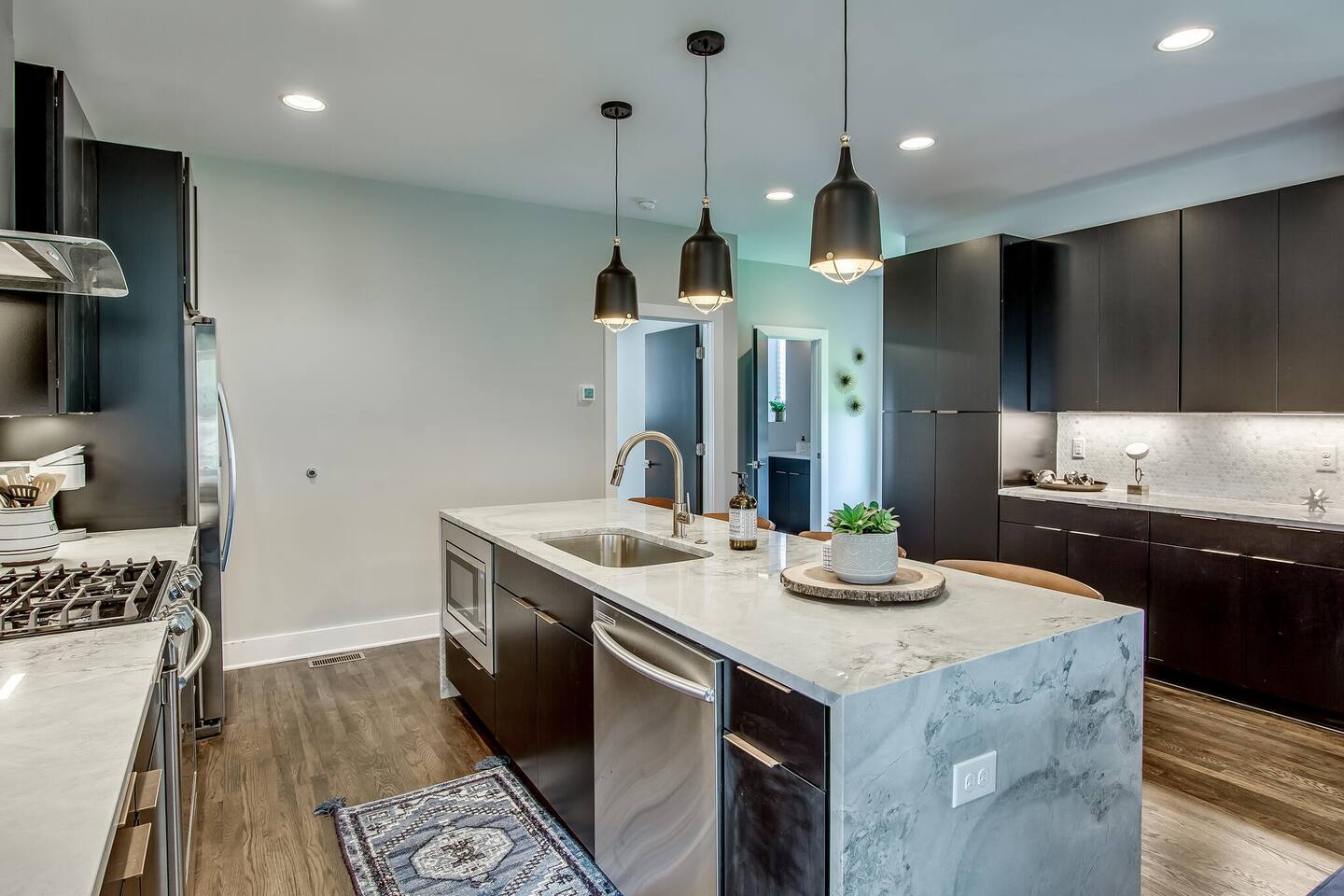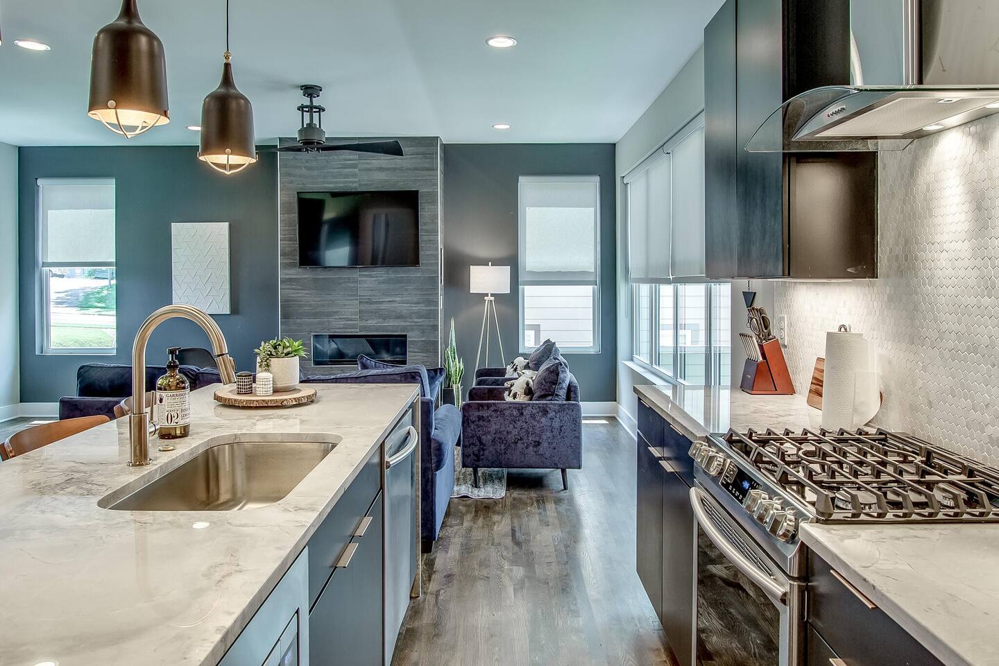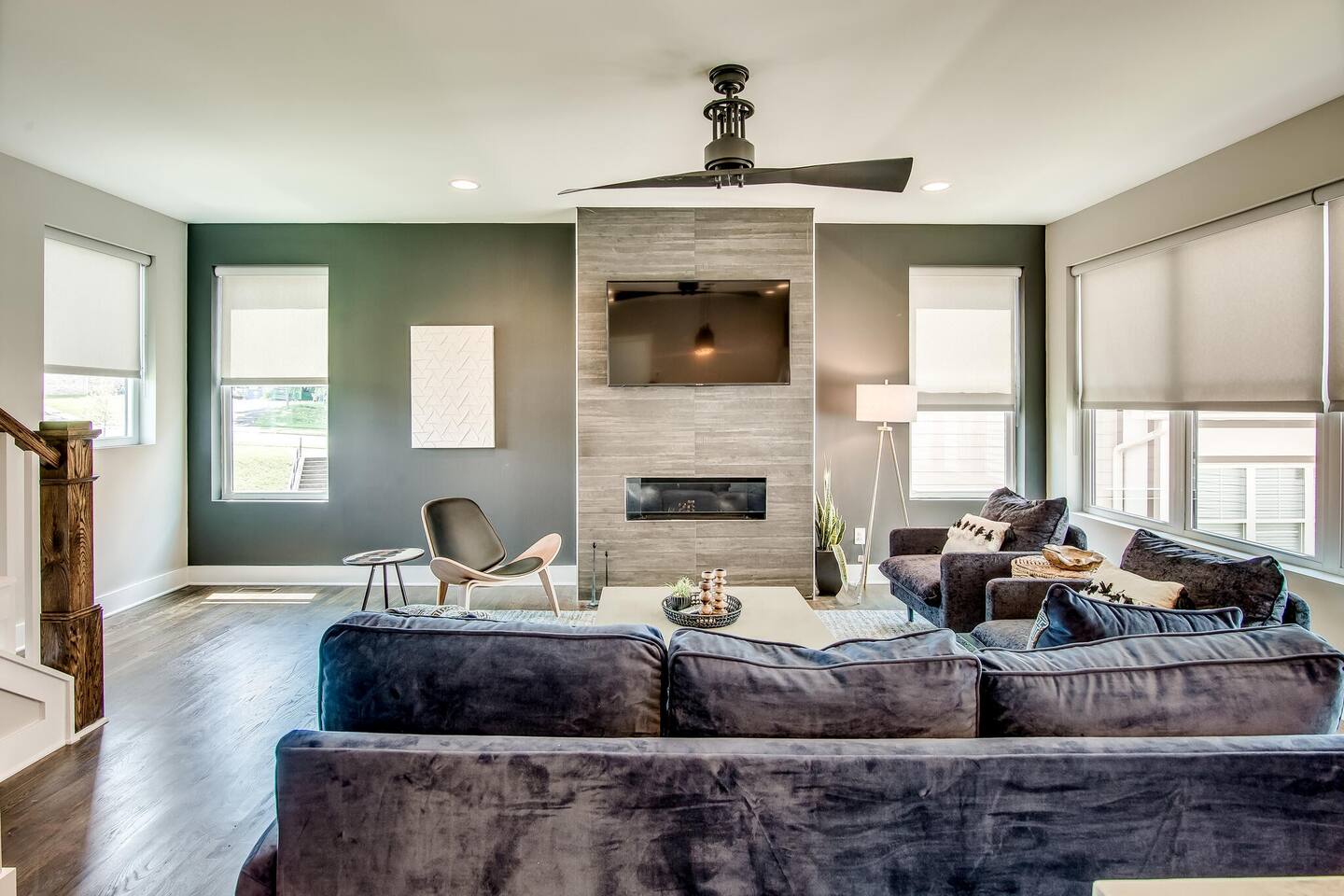 This modern home features 4 bedrooms and 4 full baths, a fully stocked kitchen w/bar seating, a spacious living room, 2 car garage, rooftop patio w/ amazing views. We are walking distance to the popular hotspot known as the Gulch. We are a short $5 Uber/Lyft to downtown, Broadway, Demonbreun St., Bridgestone Arena, & Nissan Stadium. Enjoy comfort with all beds Queen size or King, and plenty of room throughout the home to spread out comfortably. Early bag drop available before check in.