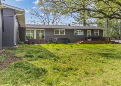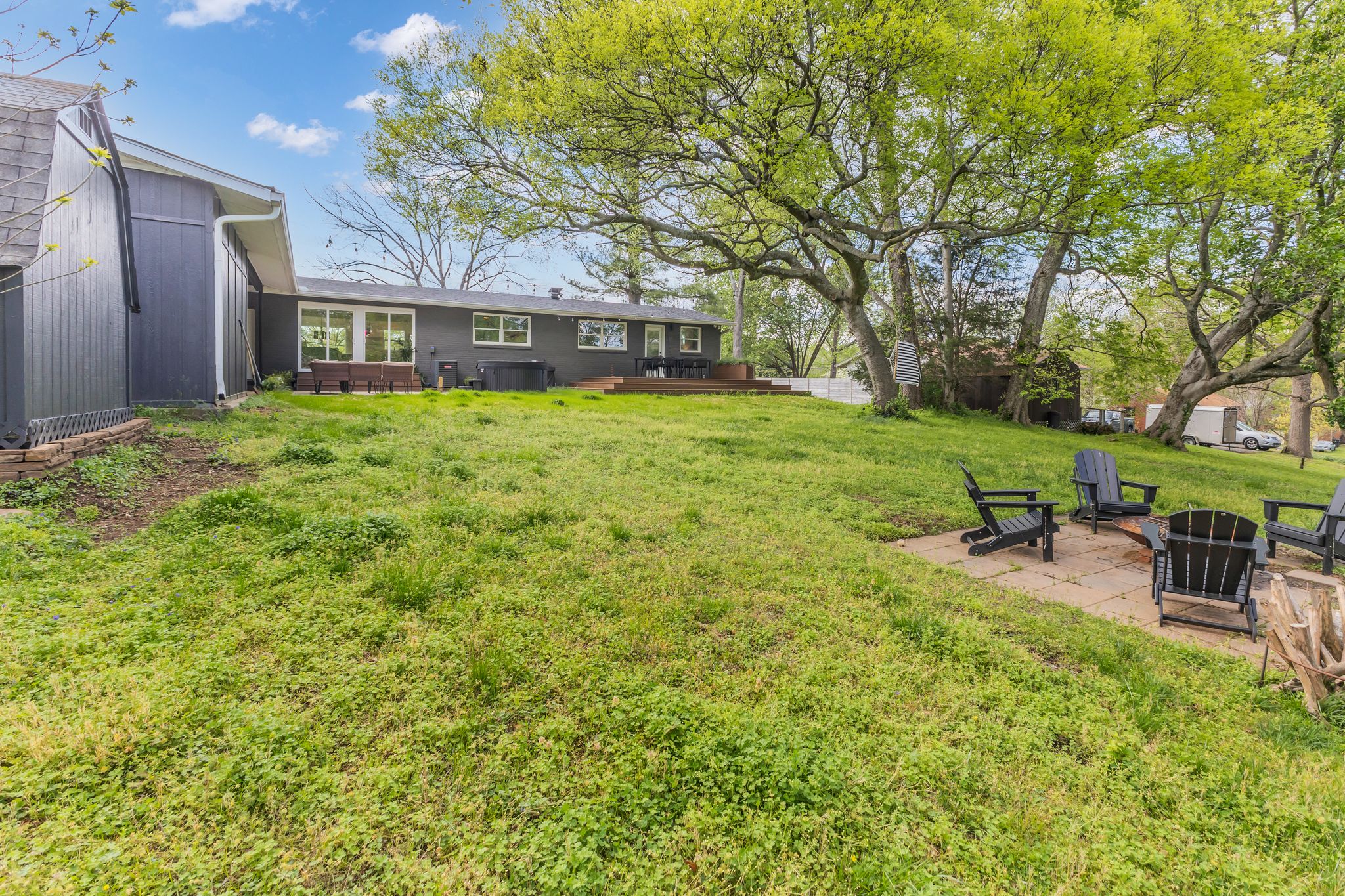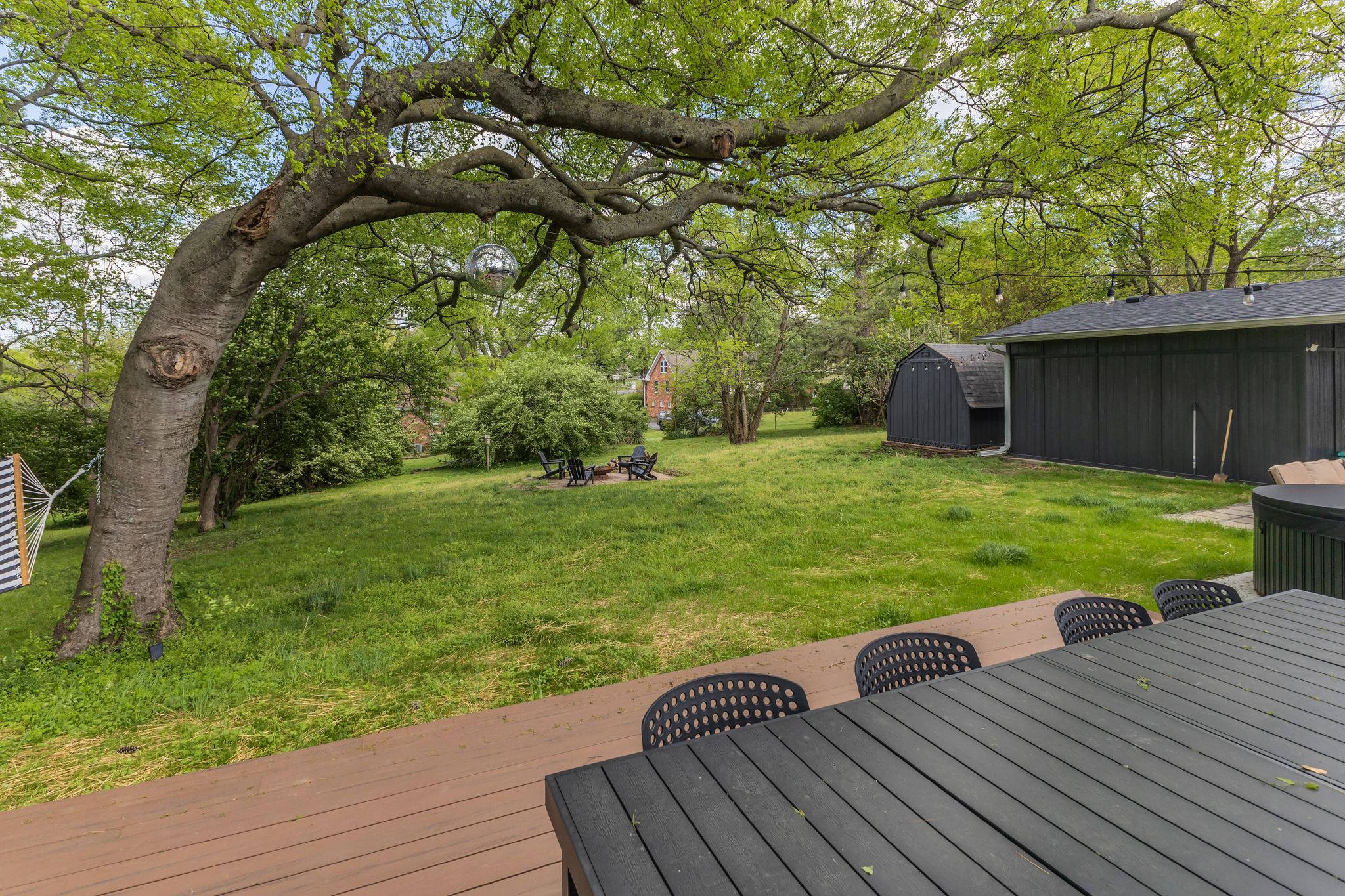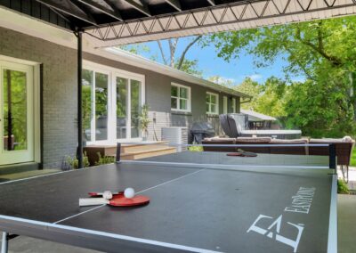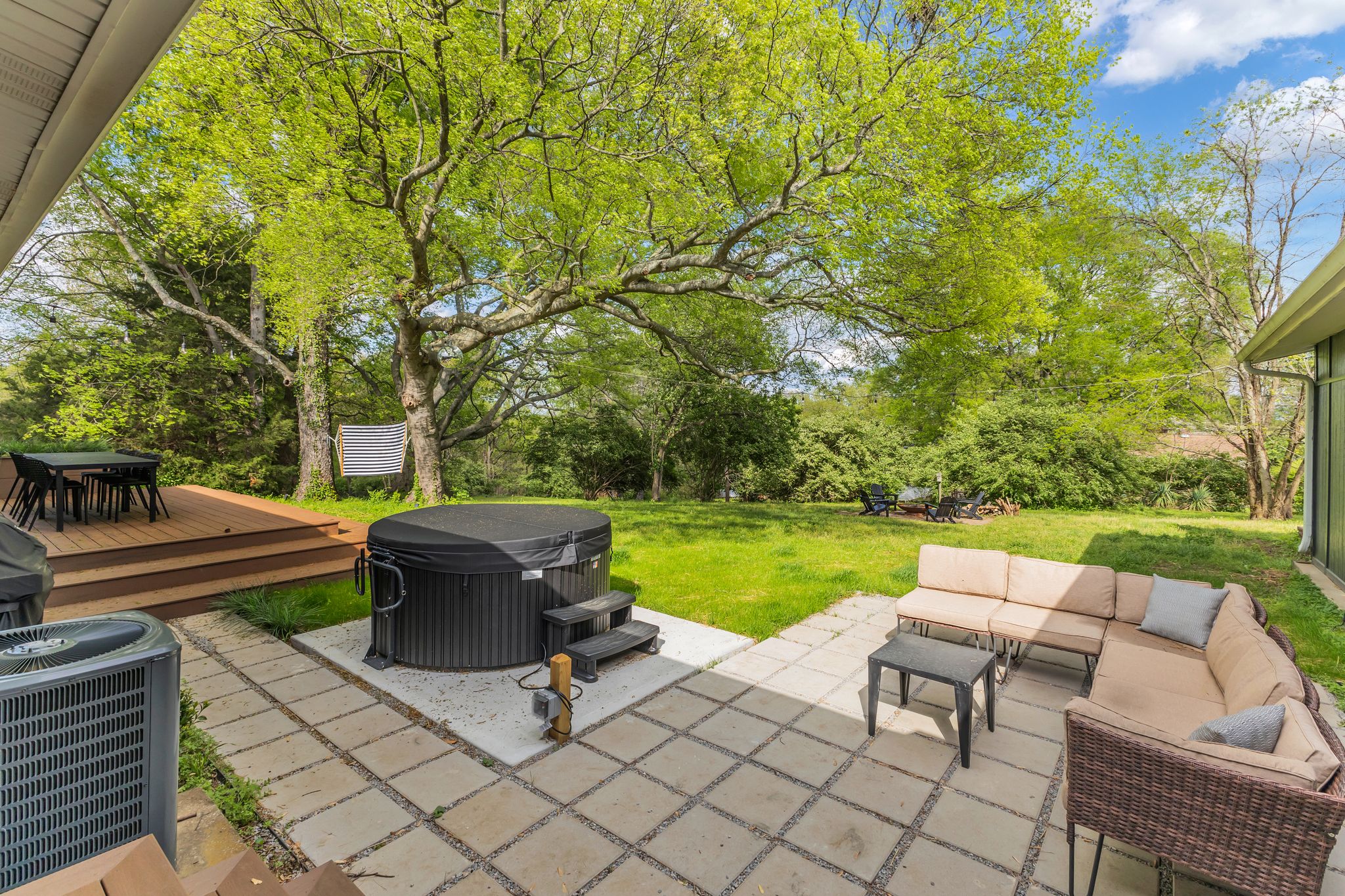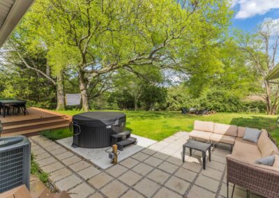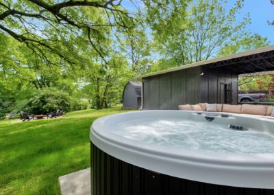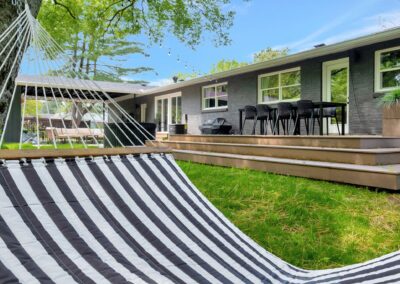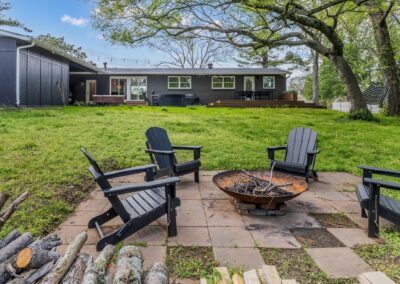 Outside, the expansive backyard is a true highlight of our rental. You can soak your worries away in the hot tub, lounge on the outdoor seating, and dine al fresco surrounded by the lush greenery. The fire pit is perfect for cozying up on chilly nights with loved ones and sharing stories and laughs. And of course, the big disco ball hanging from the tree adds a touch of whimsy and fun to your stay.