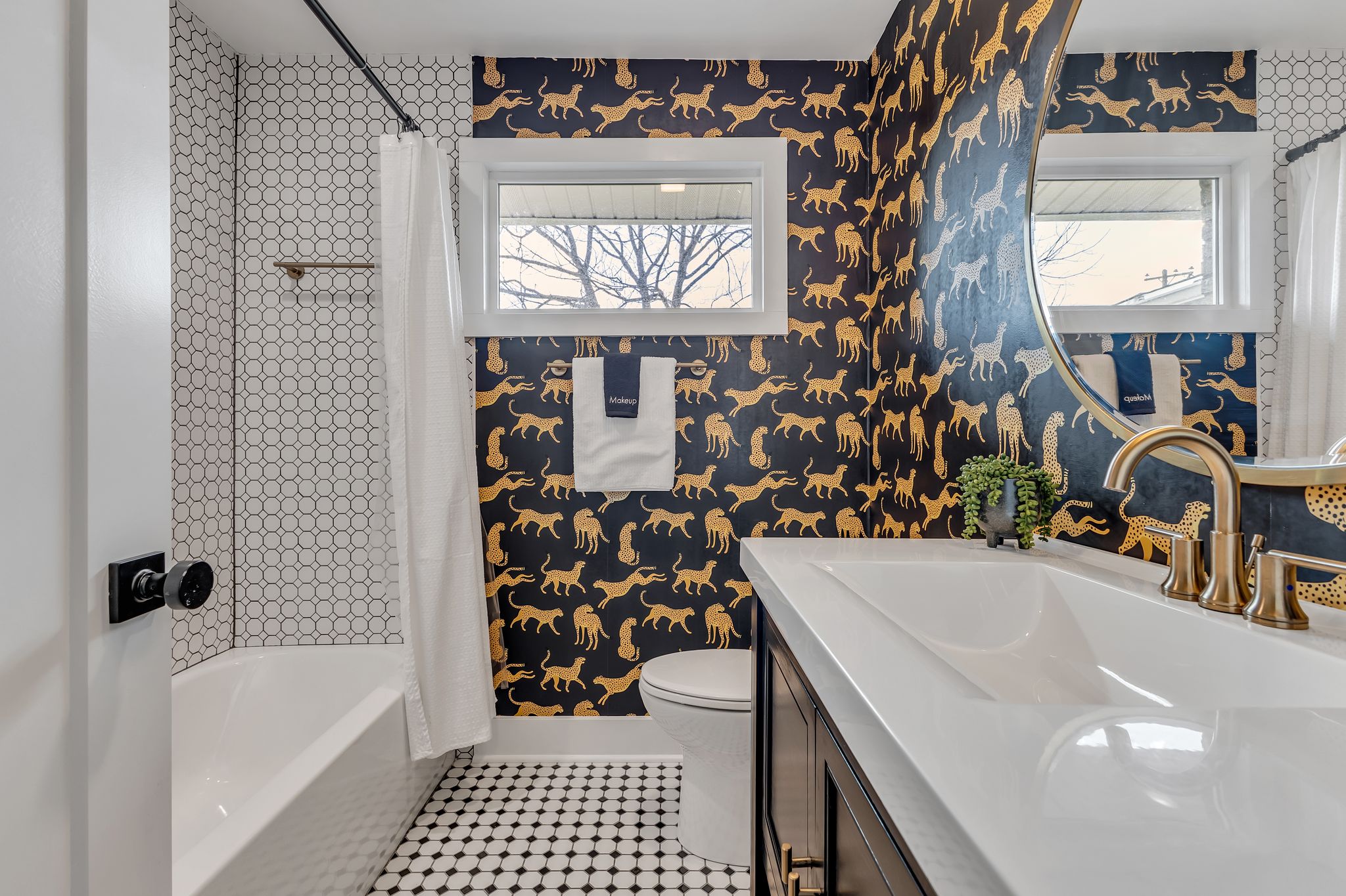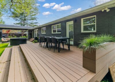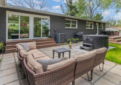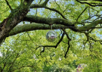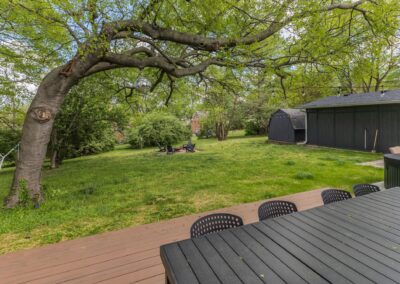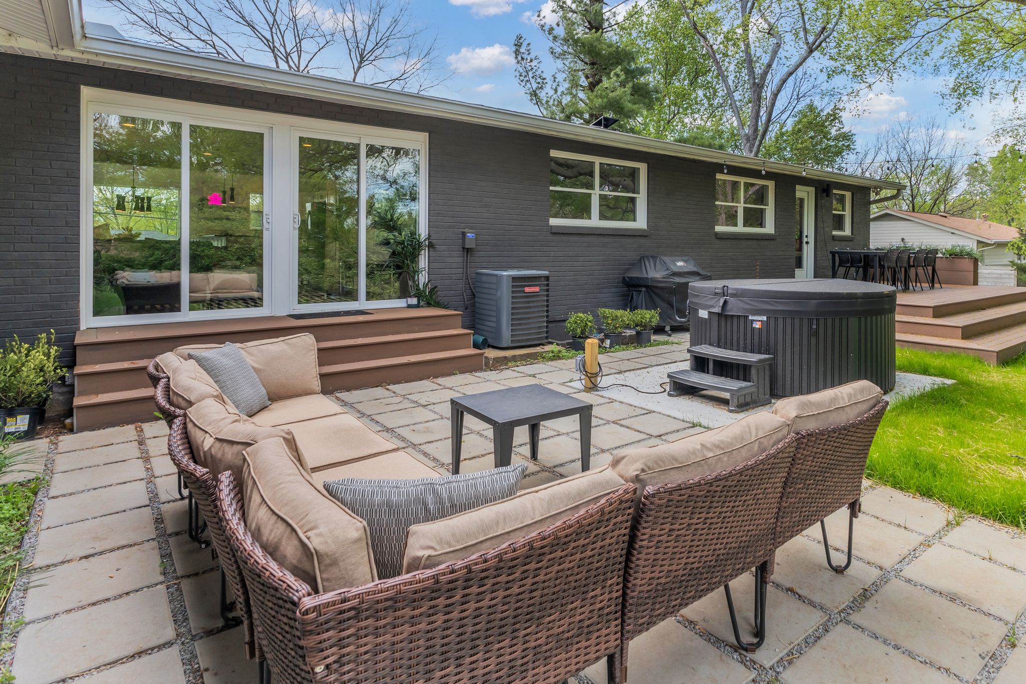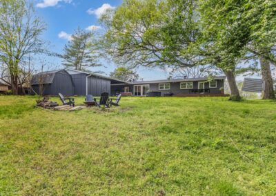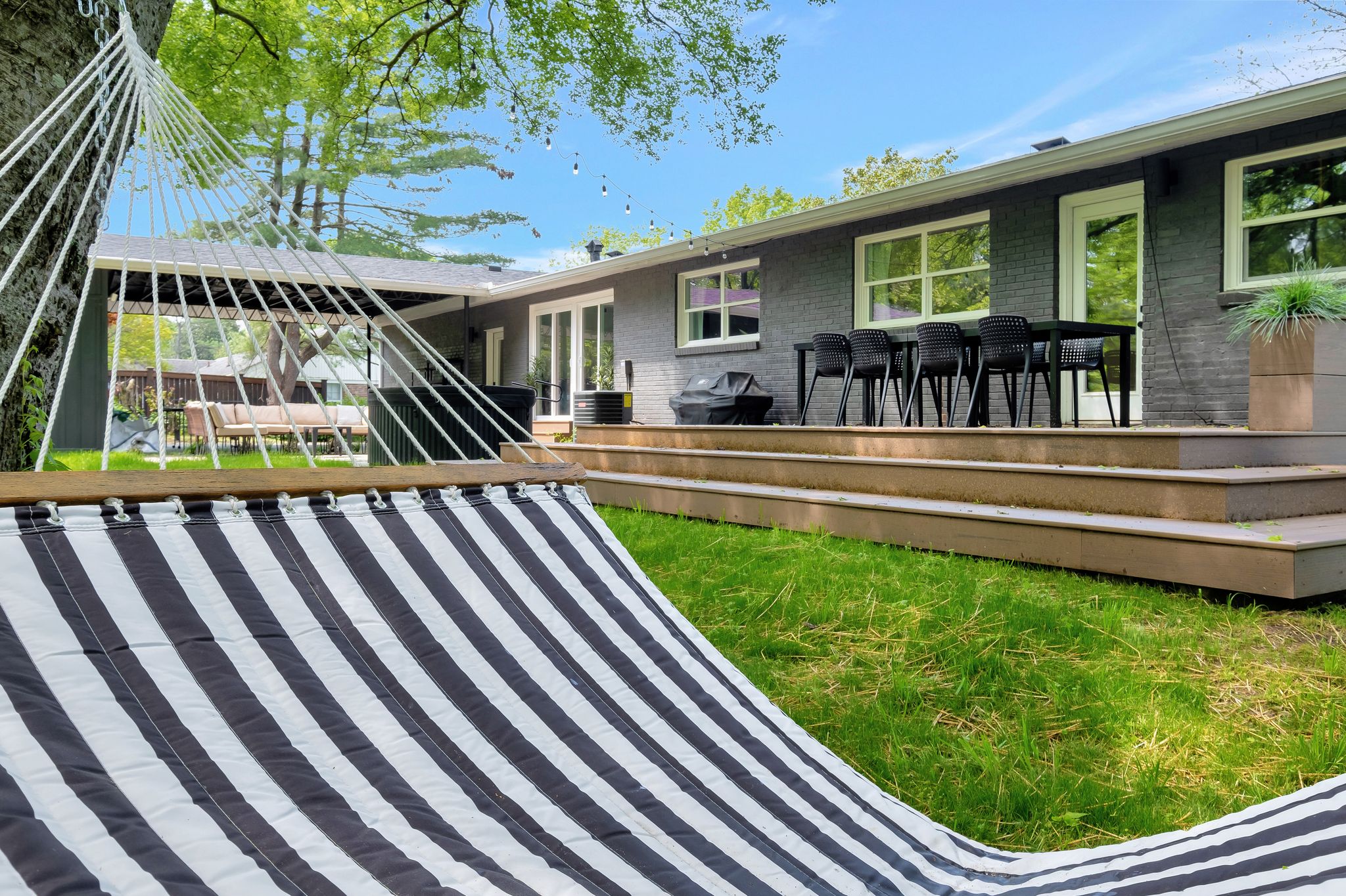 Outside, the expansive backyard is a true highlight of our rental. You can soak your worries away in the hot tub, lounge on the outdoor seating, and dine al fresco surrounded by the lush greenery. The fire pit is perfect for cozying up on chilly nights with loved ones and sharing stories and laughs. And of course, the big disco ball hanging from the tree adds a touch of whimsy and fun to your stay.