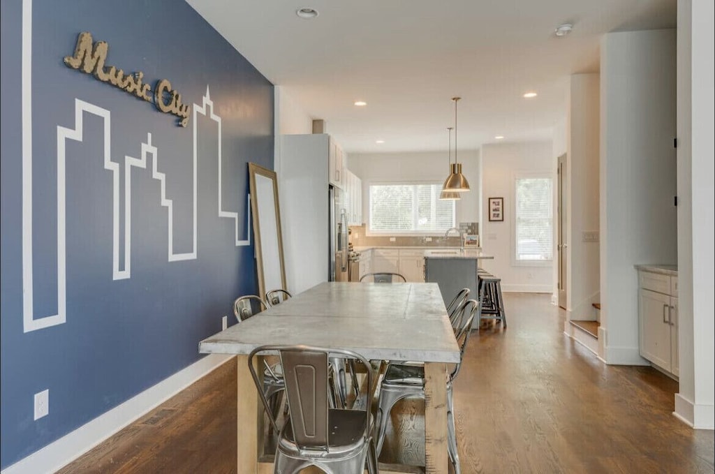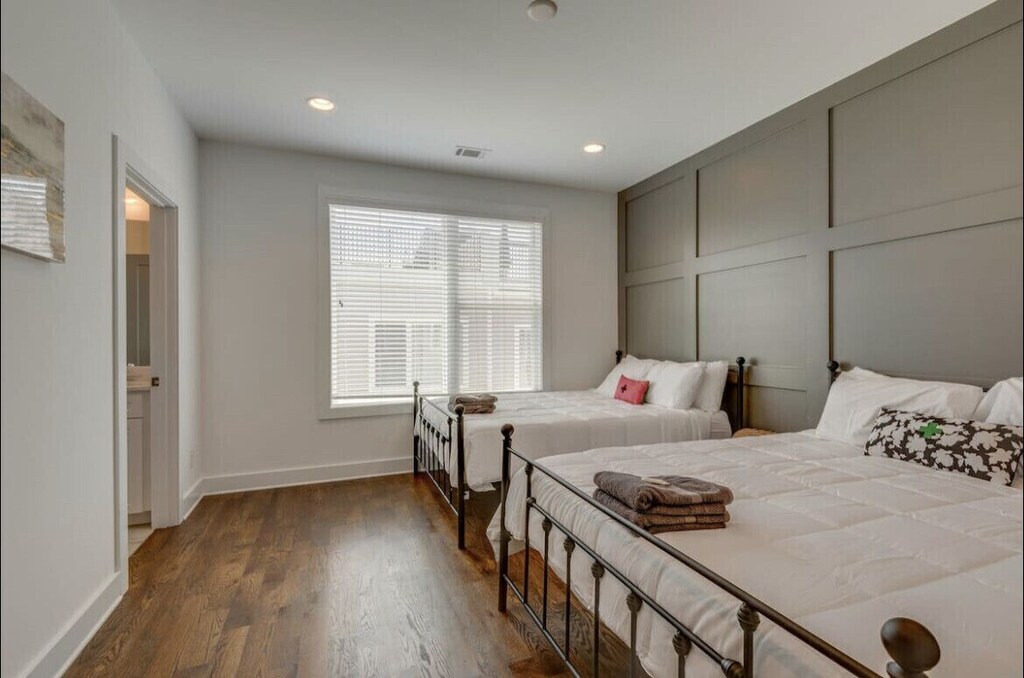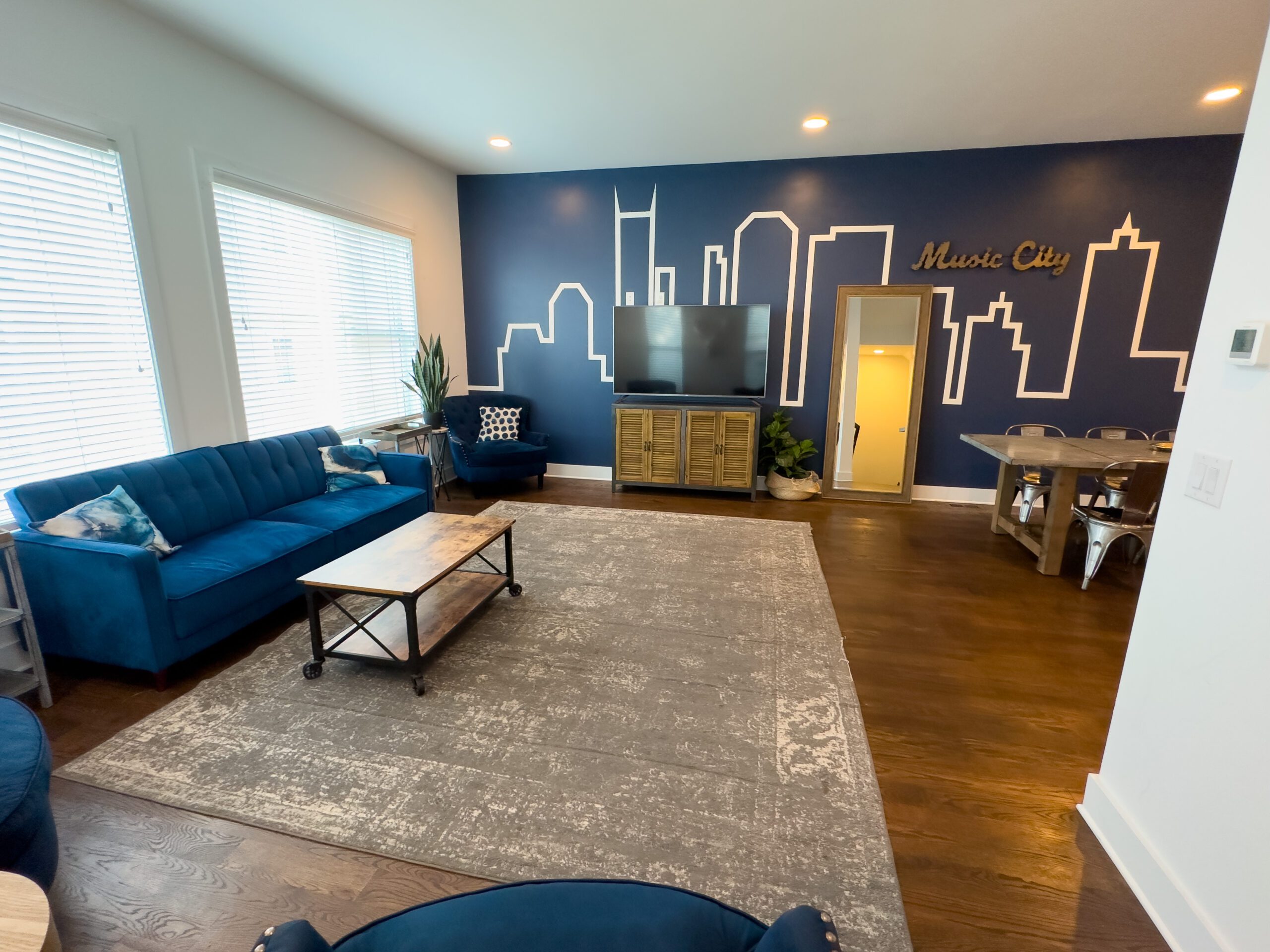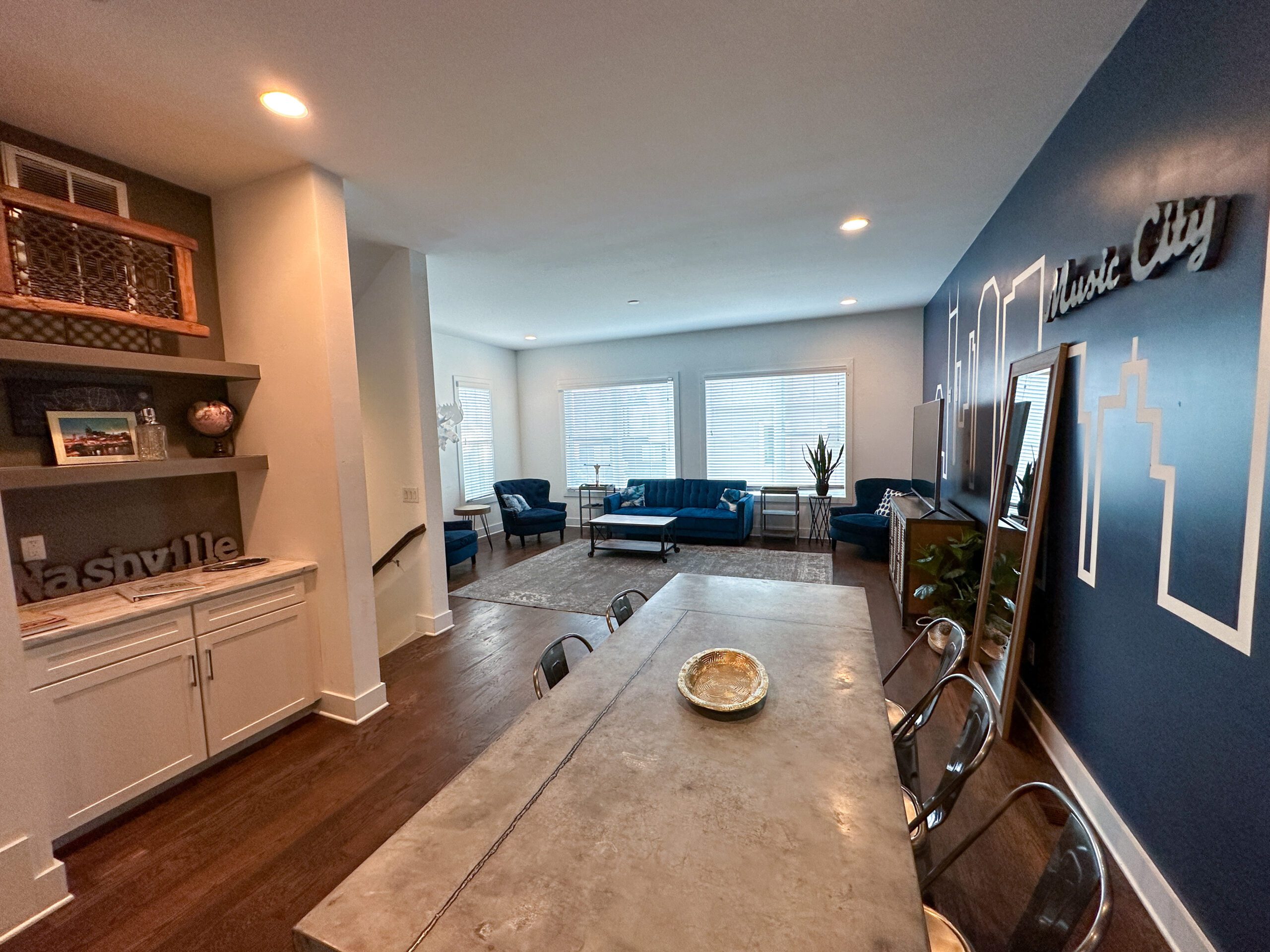 This newly constructed modern luxury home features 4 bedrooms, 3.5 baths, a fully stocked kitchen, open living space, private 2 car garage, and a large 3rd floor patio with amazing views of Nashville. The large rooms make this home ideal for group events, family vacations, and business groups. We are a short $5-10 Uber/Lyft to downtown. Early bag drop before check in is available by request for an additional $50.