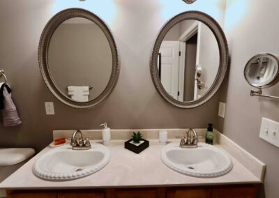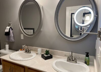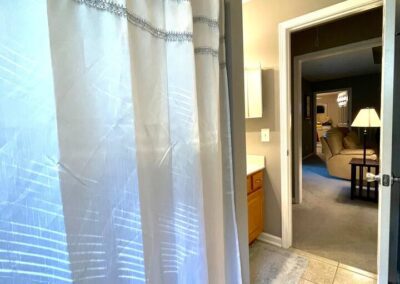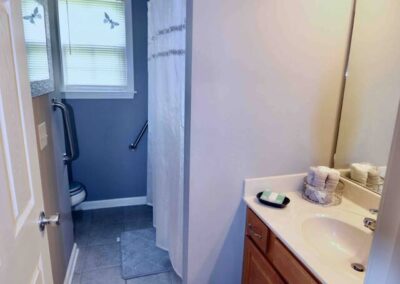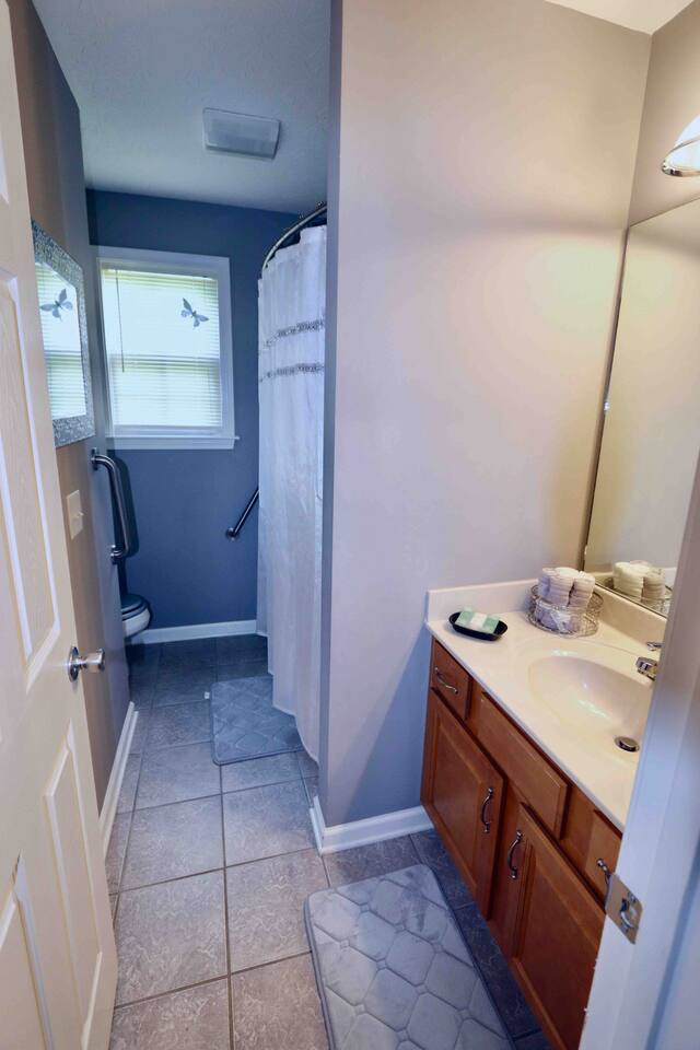 Bathroom: Vanity and handicap accessible toilet and shower.