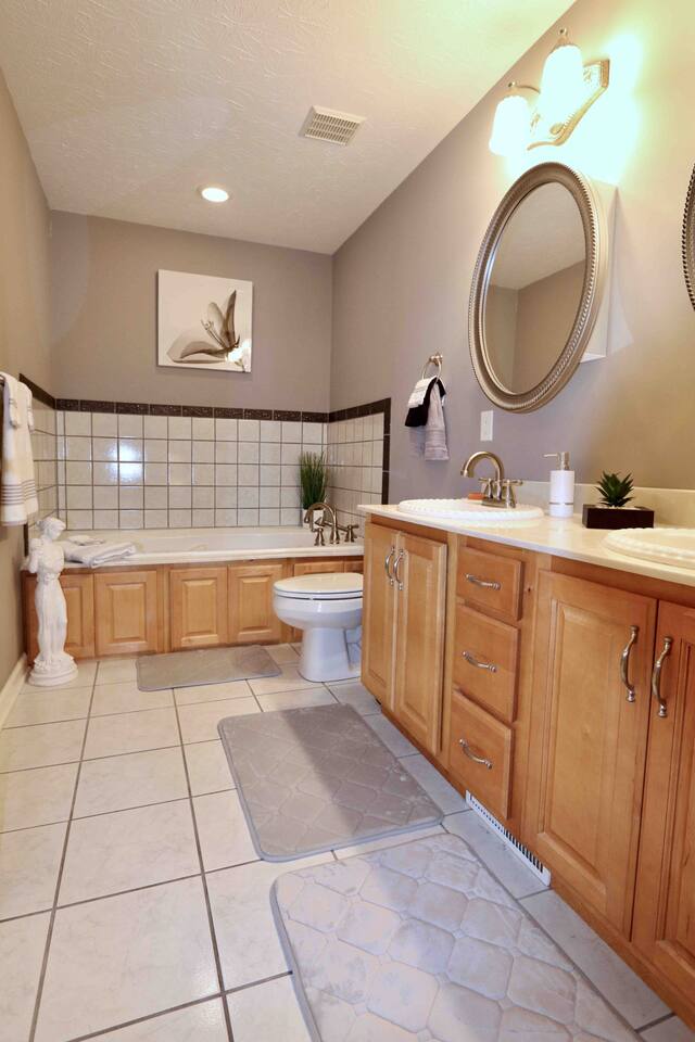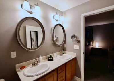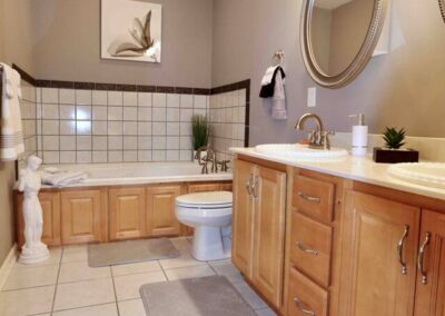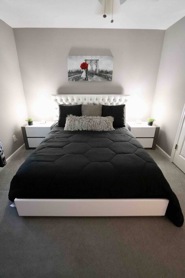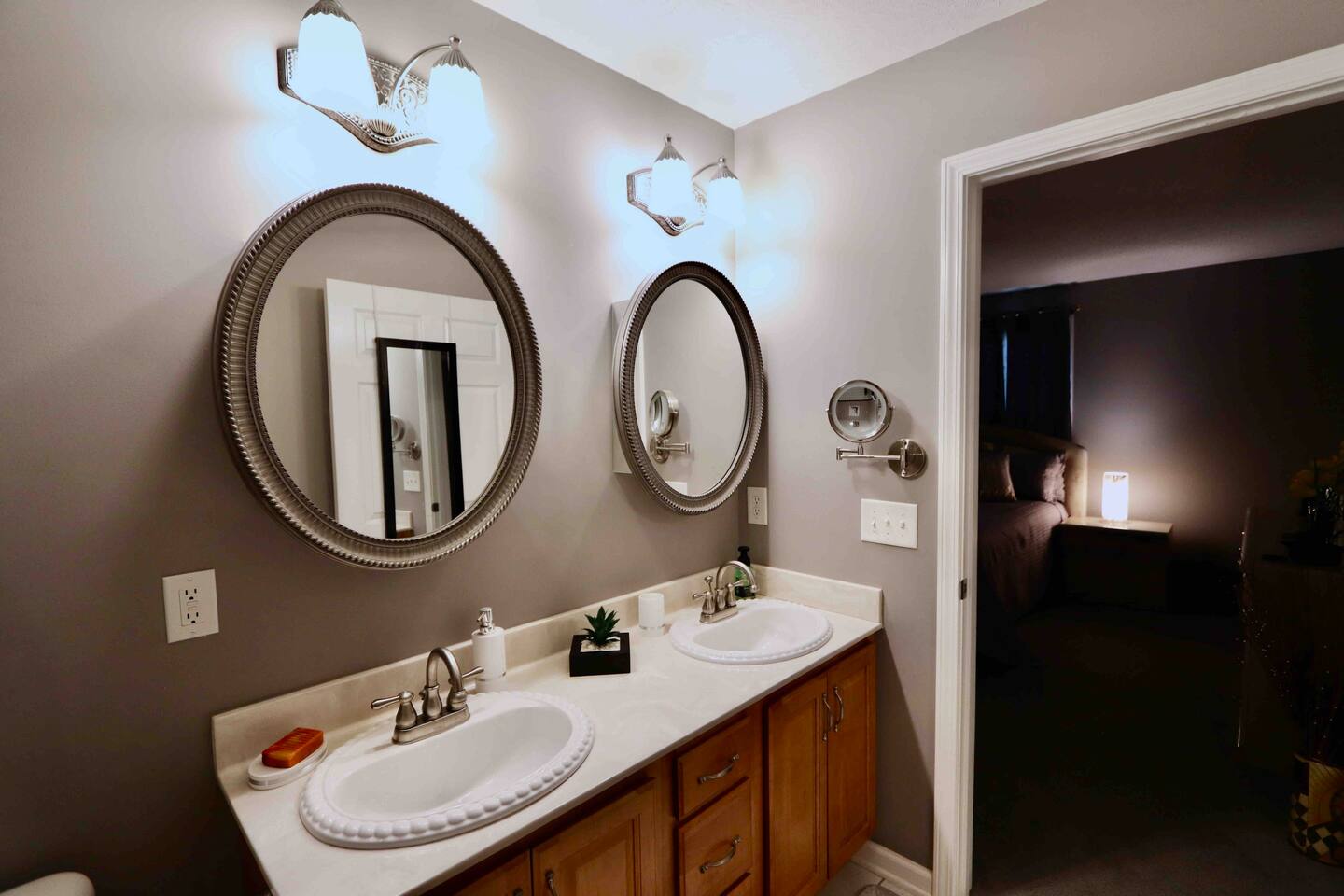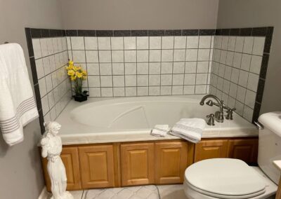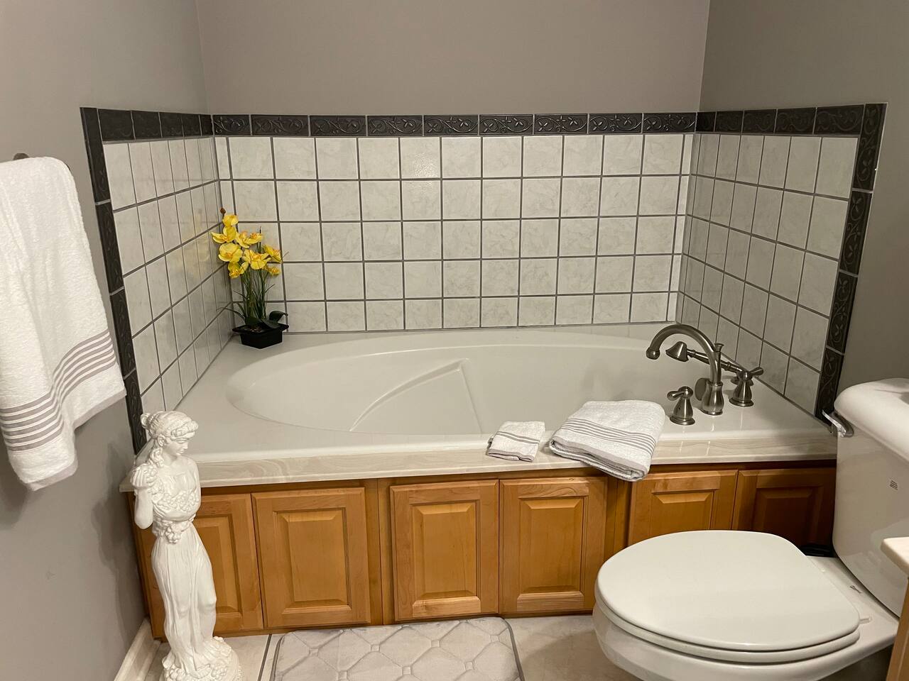 Master Bedroom is directly to the left upon entry, with a plush king bed, walk in closet and en-suite bath w twin vanities and stunning soaking tub.
