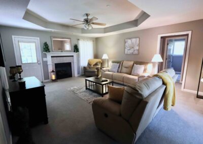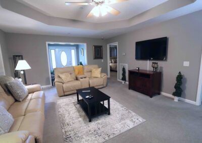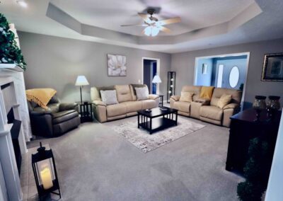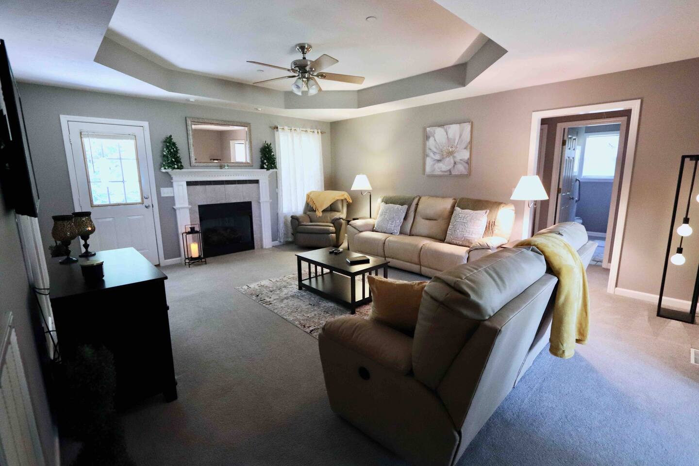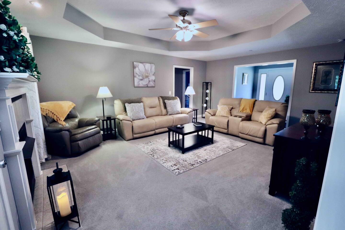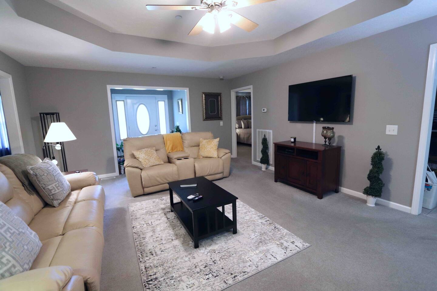 Walk up the front steps past the gorgeous landscaping and enter into the foyer. Straight ahead is the spacious living room with reclining couches and smart TV.