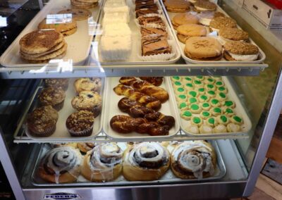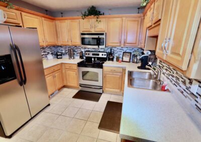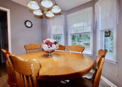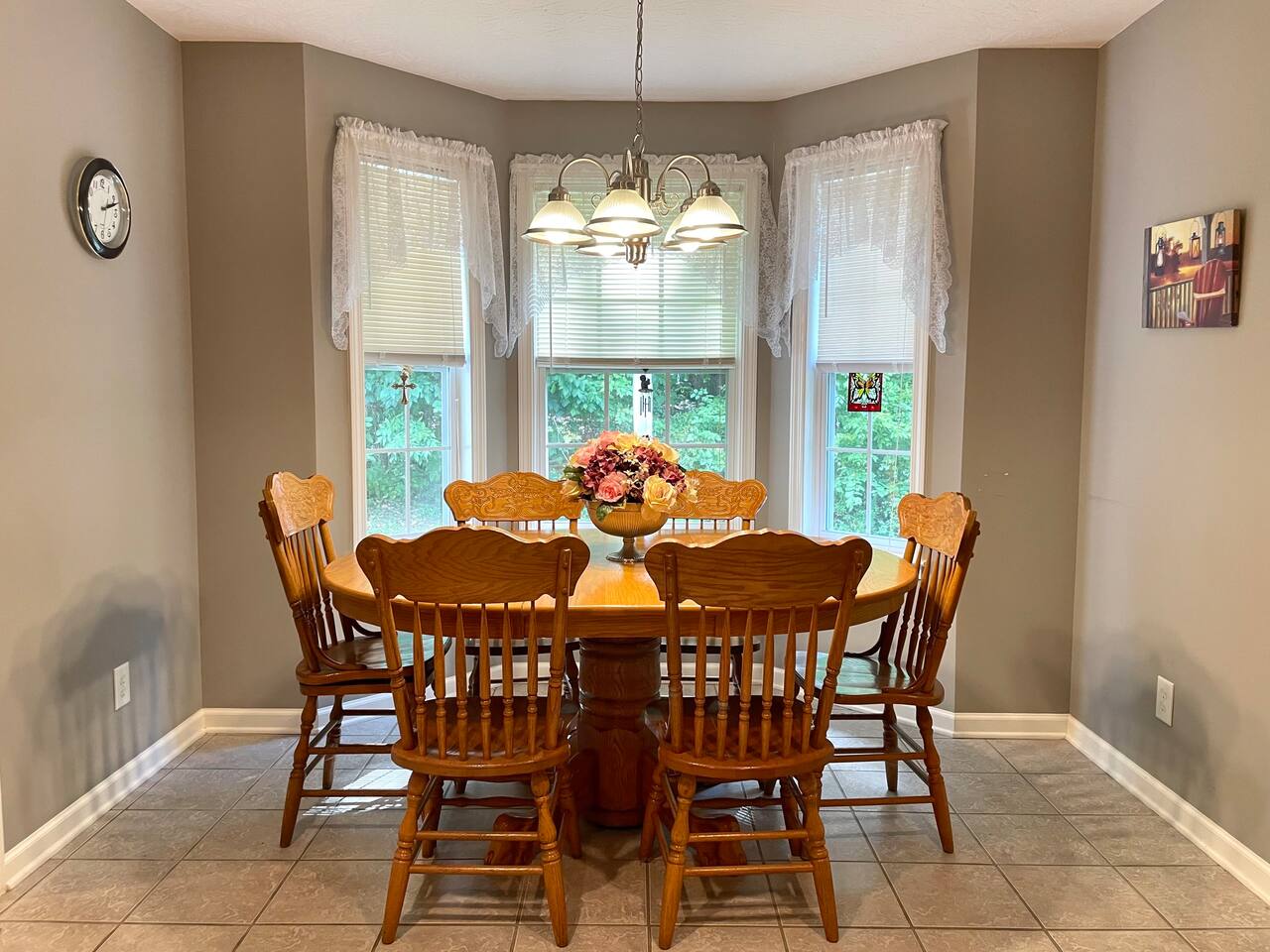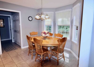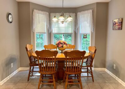 The full sized chef’s kitchen and dining space are through the archway to the left of the living room, soaked in natural sunlight from the bay windows.