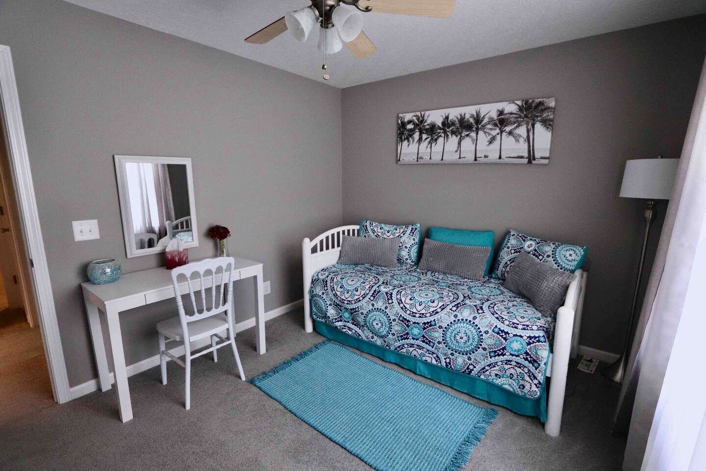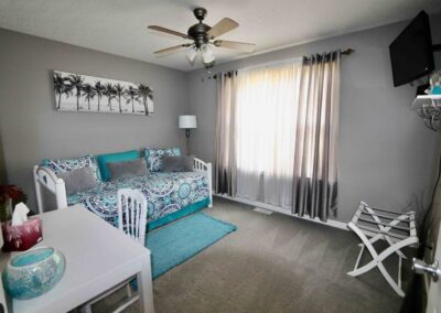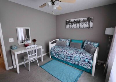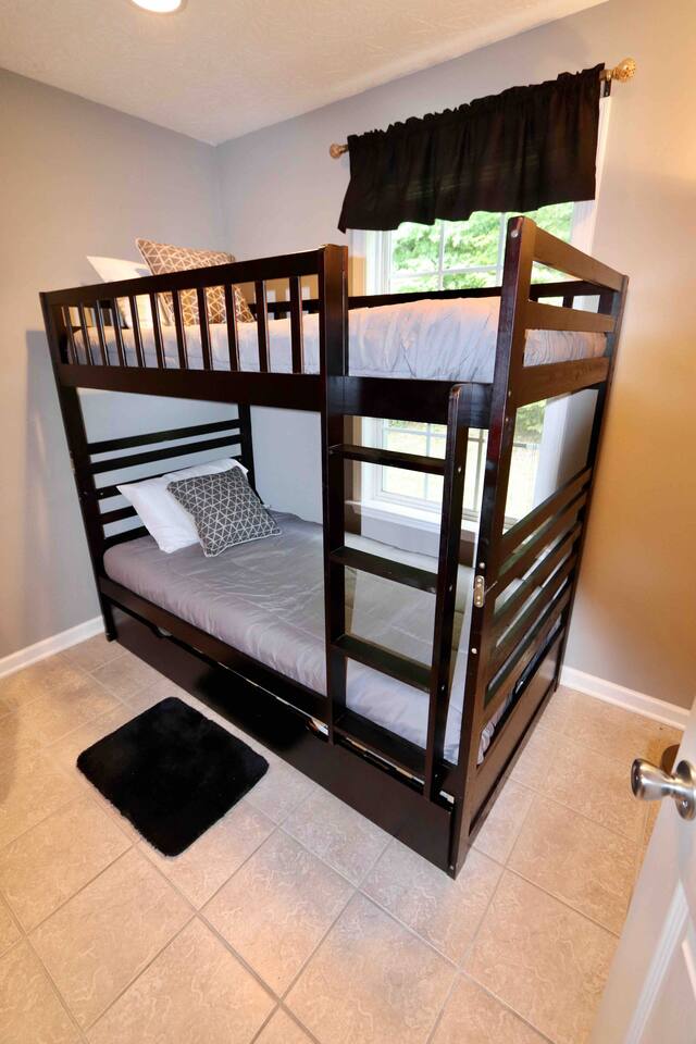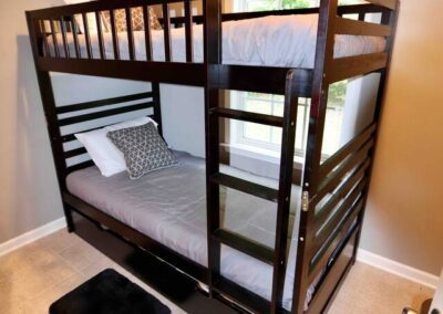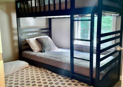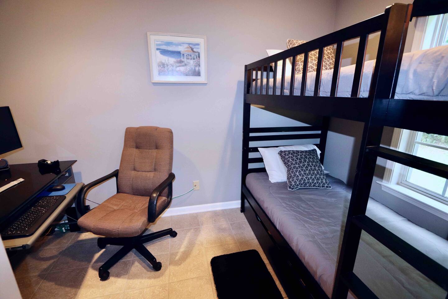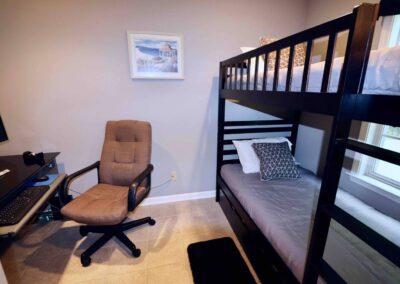 Walk past the laundry closet to find Bedroom 4: Twin over twin bunk bed, twin trundle, and office space.