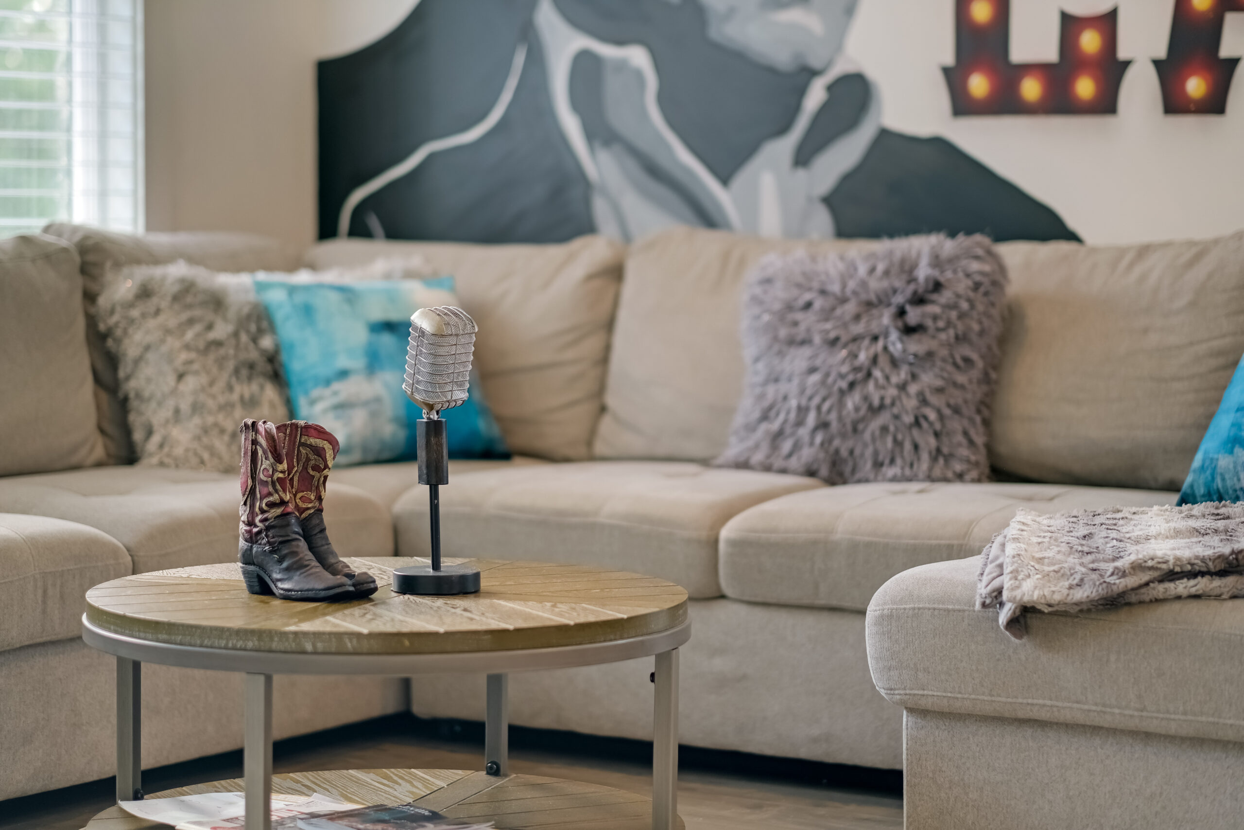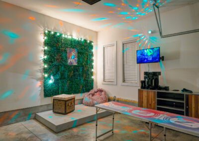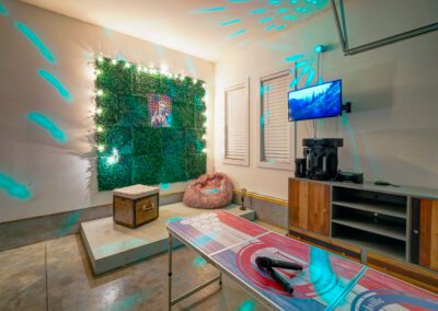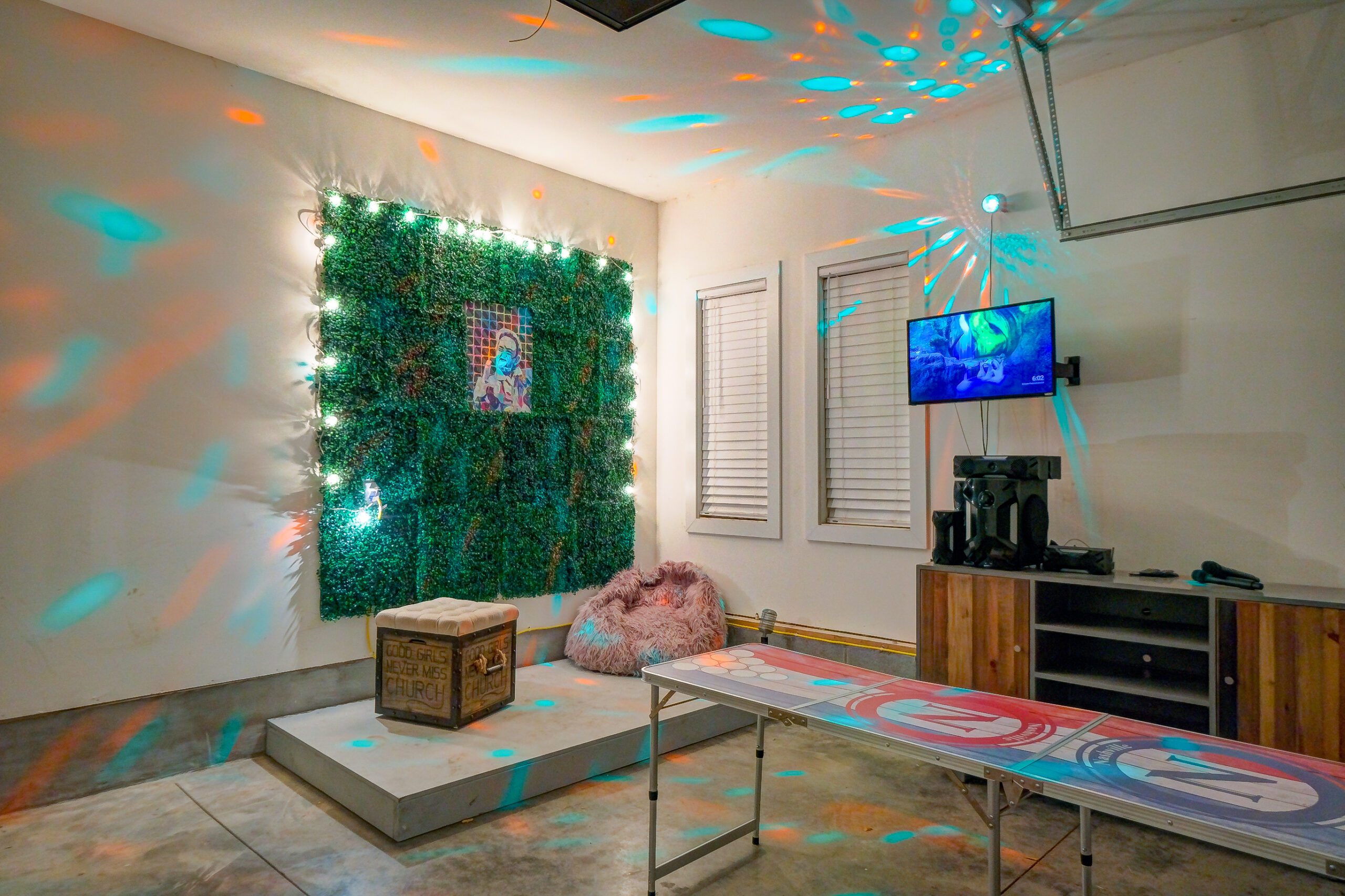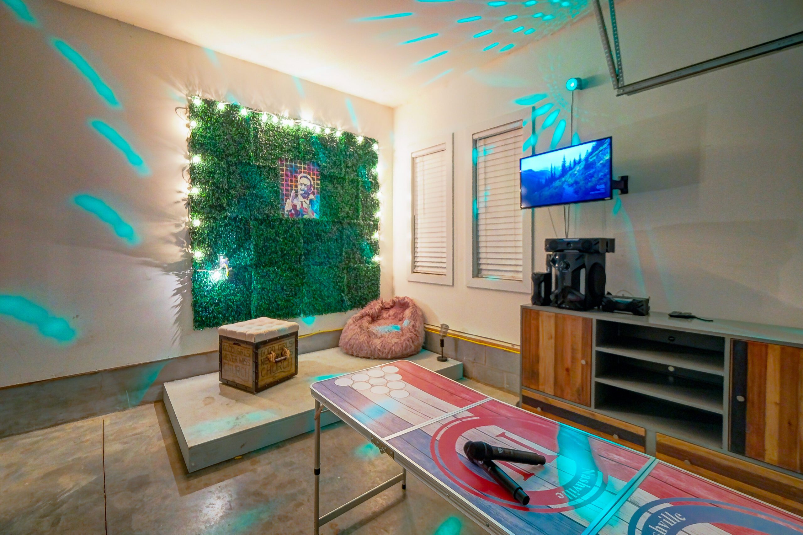 Our garage is outfitted with a custom karaoke stage and machine, along with a beer pong table!