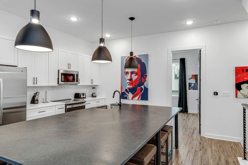 Cash me in Nashville at “The Johnny!” Brand new themed home with a rooftop large enough for your entire group. 4BR/4BA with 10 beds. Rooftop features a custom built in bar w/ mini fridge and big screen TV. Less than 100 yards away is the Southern Grist Brewing an awesome East Nashville Taproom, and just across the street you can find Highland Yards, that offers everything from a coffee bar, martini bar, and gym. Don’t miss your chance to book as this home will not be available long.