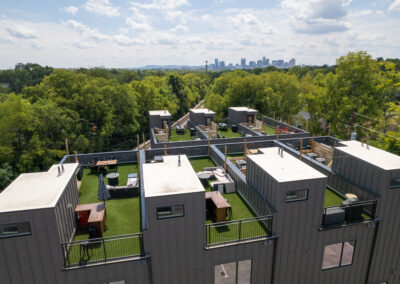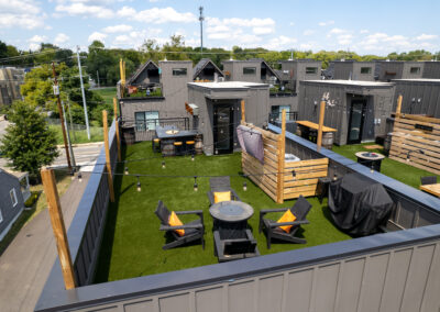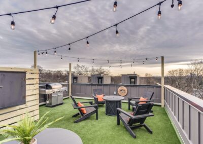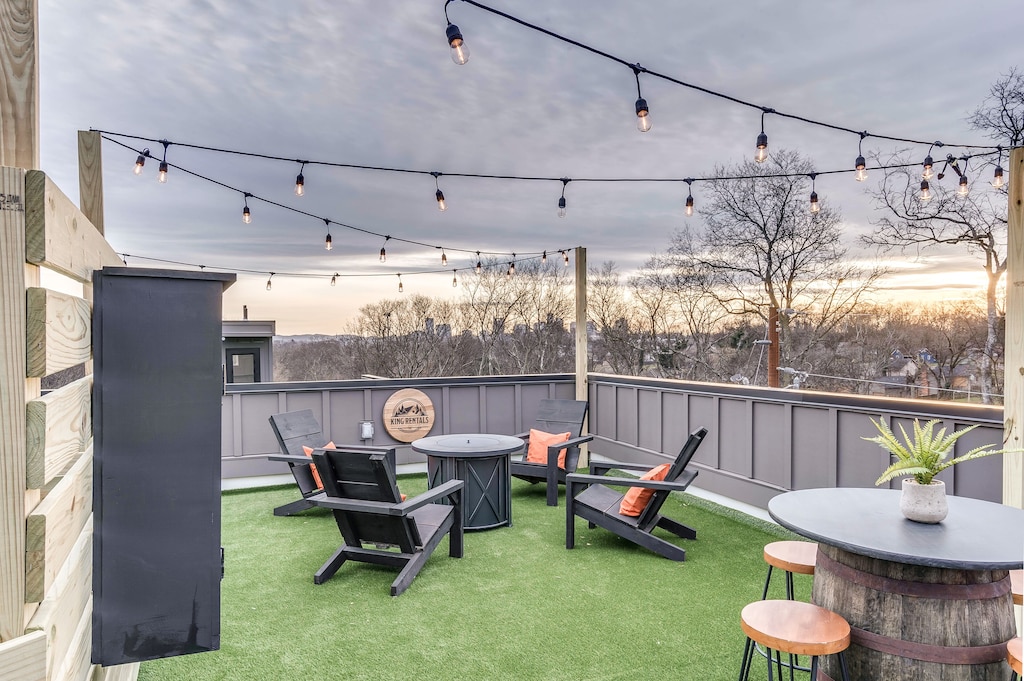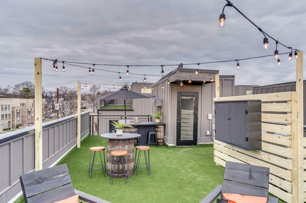 Rooftop Patio with turf flooring, custom built bar, dining table, sectional patio couch and firepit
